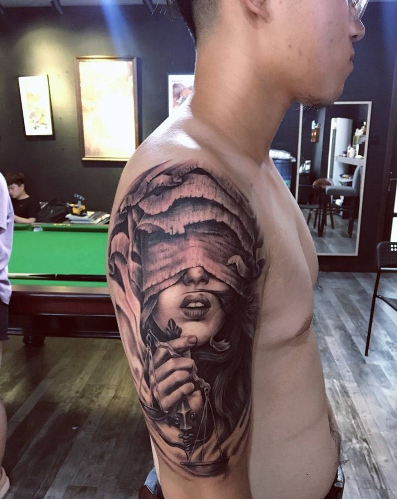 当前位置: 首页 >陕西省西安市纹身店-留白刺青纹身图案>正义女神纹身图片_成品手臂欧美写实人物原创肖像西安义刺青纹身图案