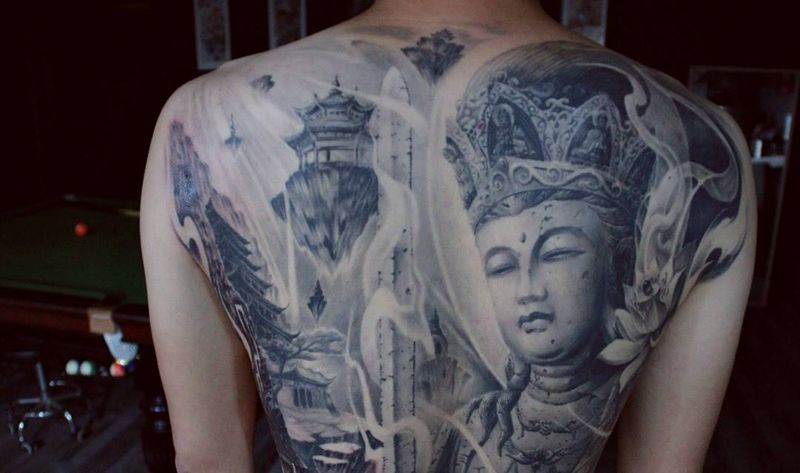 当前位置: 首页 >陕西省西安市纹身店-留白刺青纹身图案>石裂虚空藏菩萨纹身图片_成品背部传统写实人物宗教西安义刺青纹身图案