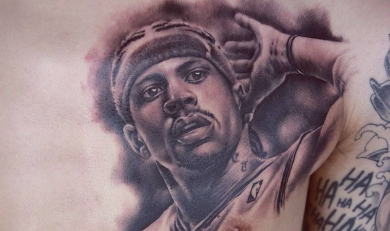 当前位置: 首页 >陕西省西安市纹身店-留白刺青纹身图案>Iverson纹身图片_西安义刺青人物肖像写实欧美胸部成品纹身图案