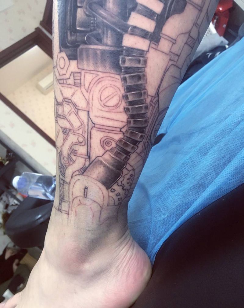 机械小腿未完成纹身图片_原创腿部写实纹身图案
