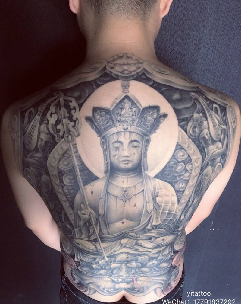 满背石裂地藏王菩萨纹身图片_西安义刺青原创成品背部欧美写实传统人物宗教纹身图案