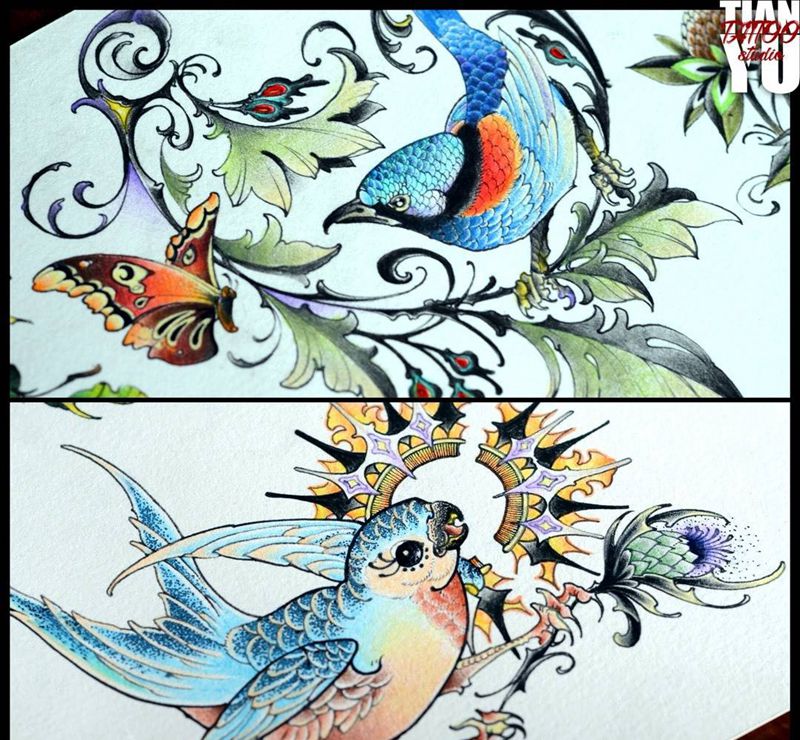 西安天予刺青手稿作品纹身图片_原创成品插画清新动物植物西安黑灰彩色纹身图案