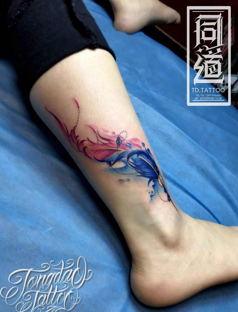 当前位置: 首页 >陕西省西安市纹身店-陕西同道堂文化传播有限公司纹身图案>羽毛纹身图片_腿部水墨水彩纹身图案