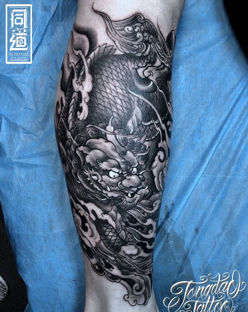 • T网红王老大花腿龙纹身图片_腿部新传统纹身图案