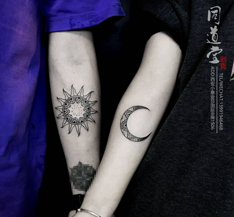 当前位置: 首页 >陕西省西安市纹身店-陕西同道堂文化传播有限公司纹身图案>情侣纹身:日月相随纹身图片_手臂图腾点刺纹身图案