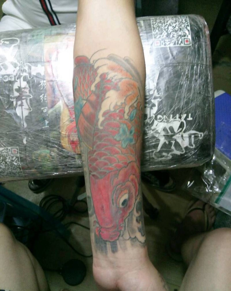 当前位置: 首页 >陕西省西安市纹身店-西安小黑刺青纹身图案>彩色鲤鱼纹身图片_手臂传统动物成品纹身图案