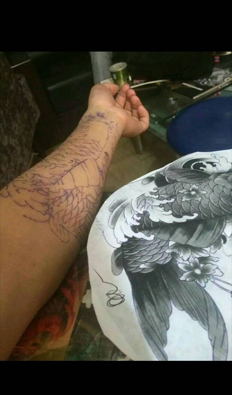 当前位置: 首页 >陕西省西安市纹身店-西安小黑刺青纹身图案>彩色鲤鱼半包纹身图片_传统动物纹身图案