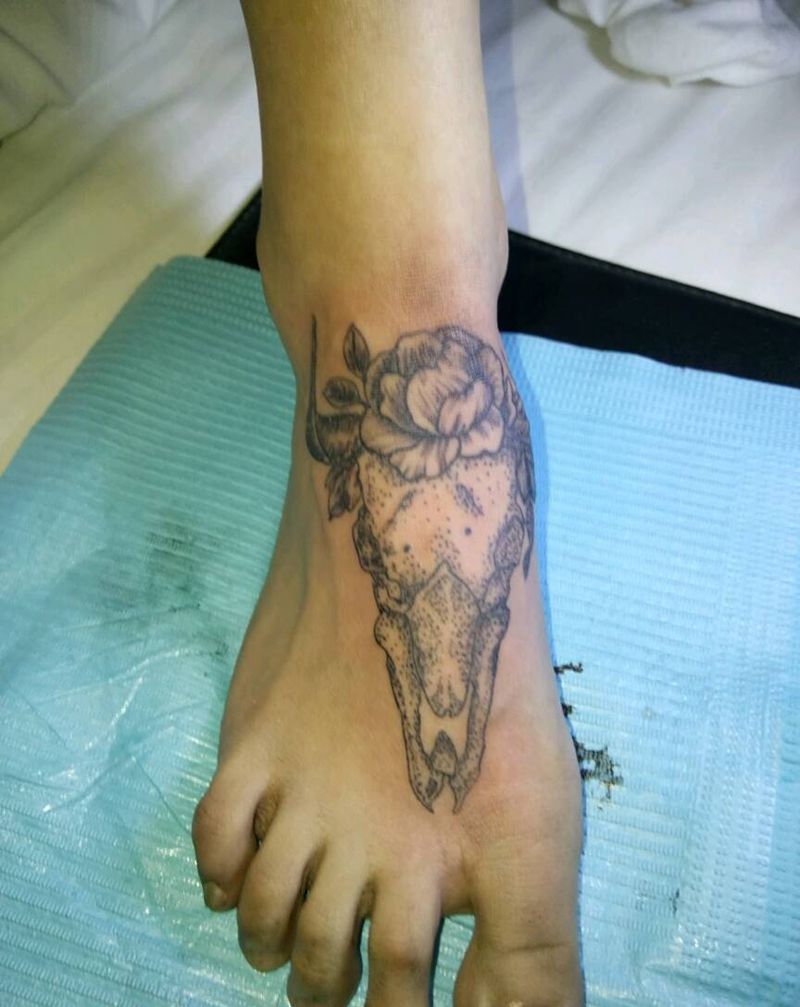 羊头点线纹身图片_脚部几何动物成品纹身图案