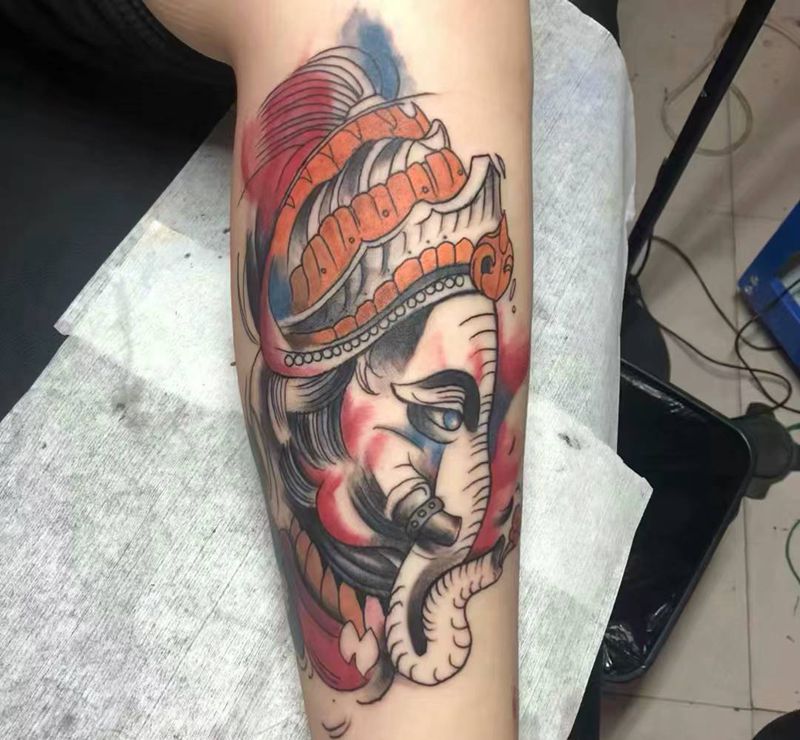 水彩象神纹身图片_手臂腿部水墨新传统象神纹身图案