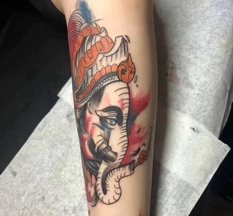 水彩象神纹身图片_手臂腿部水墨新传统象神纹身图案