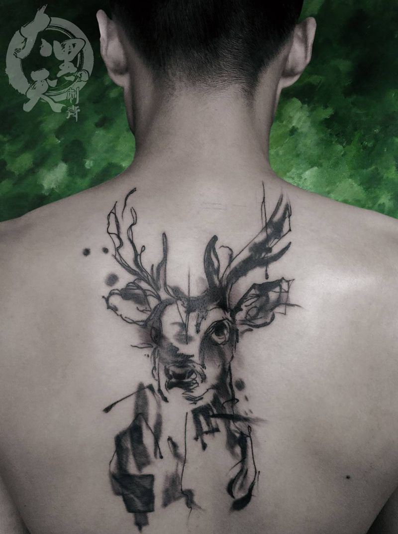 当前位置: 首页 >陕西省西安市纹身店-西安大黑天刺青纹身图案>麋鹿纹身图片_成品背部国画写实传统原创动物纹身图案