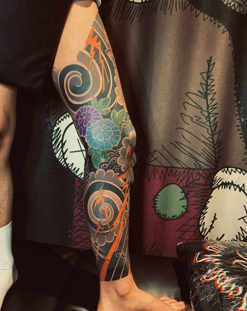 • T网红王老大花腿龙纹身图片_腿部新传统纹身图案