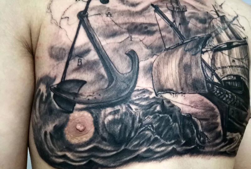 扬帆起航纹身图片_胸部欧美写实帆船纹身图案
