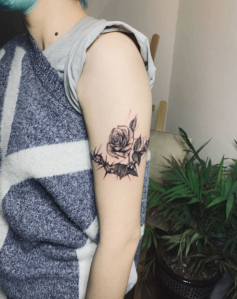 当前位置: 首页 >陕西省宝鸡市纹身店-宝鸡久予刺青工作室纹身图案>荆棘锁链玫瑰纹身图片_手臂点刺纹身图案