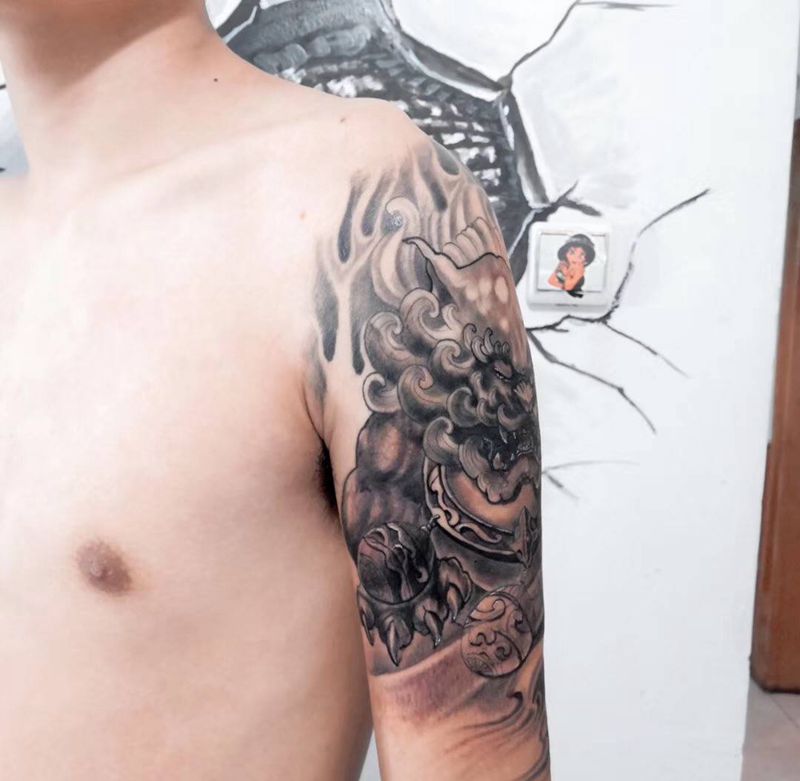 当前位置: 首页 >陕西省咸阳市纹身店-文心雕龙纹身图案>大臂唐狮纹身图片_手臂新传统唐狮纹身图案