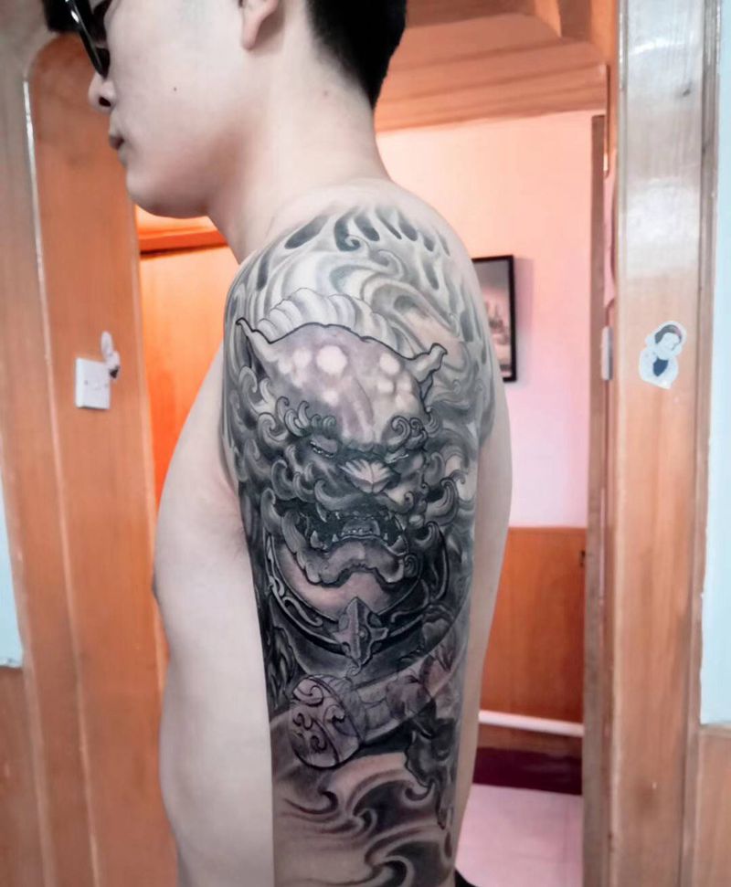 当前位置: 首页 >陕西省咸阳市纹身店-文心雕龙纹身图案>大臂唐狮纹身图片_手臂新传统唐狮纹身图案