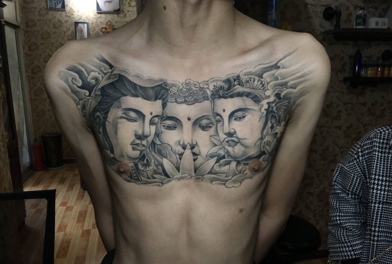 花胸三面佛纹身图片_胸部新传统三面佛 花胸纹身图案