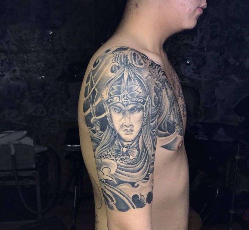 当前位置: 首页 >陕西省宝鸡市纹身店-文博刺青工作室纹身图案>赵云纹身图片_手臂胸部新传统半甲纹身图案