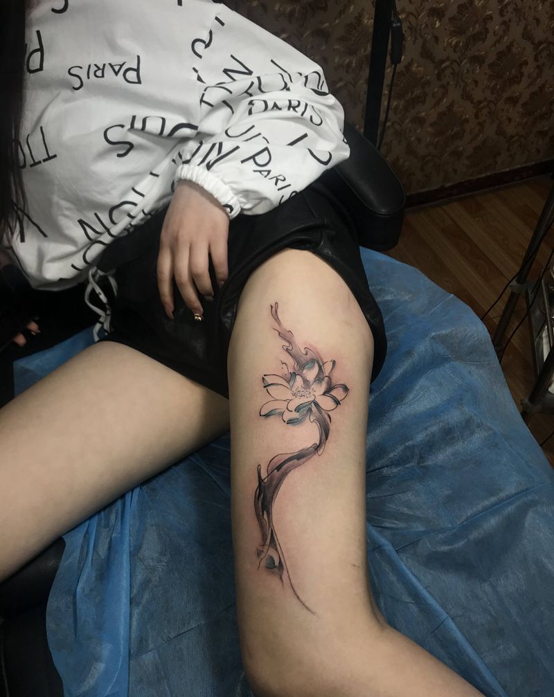 当前位置: 首页 >陕西省宝鸡市纹身店-文博刺青工作室纹身图案>荷花纹身图片_腿部水墨水彩纹身图案
