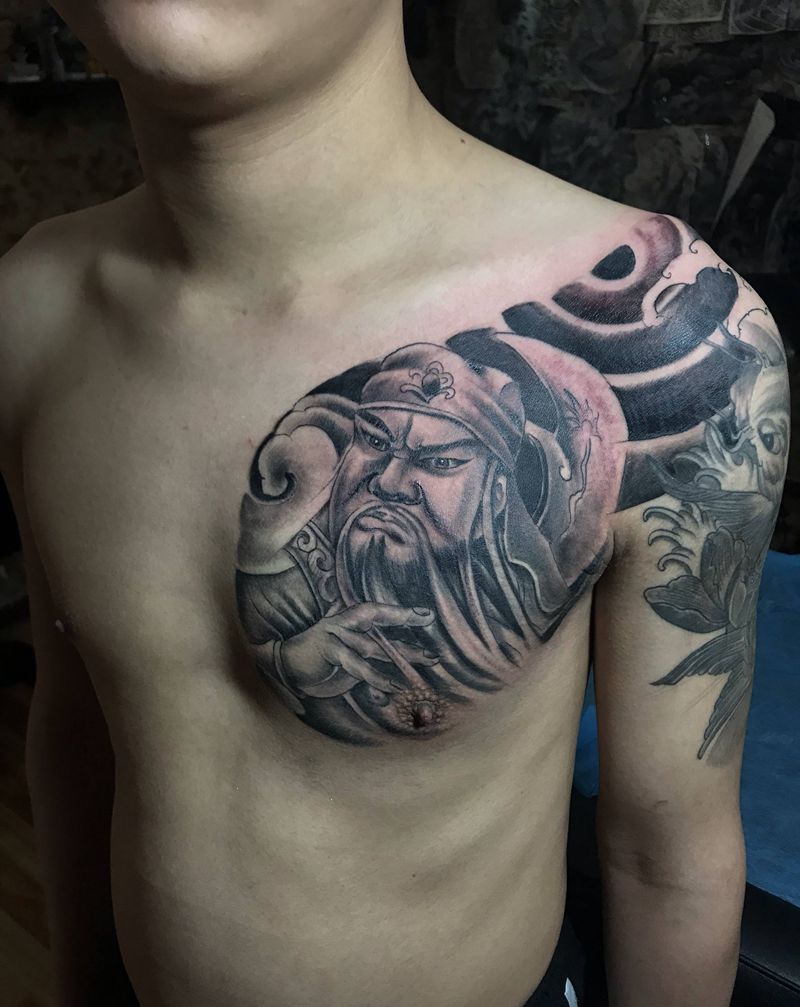 当前位置: 首页 >陕西省宝鸡市纹身店-文博刺青工作室纹身图案>关公半甲纹身图片_胸部新传统纹身图案