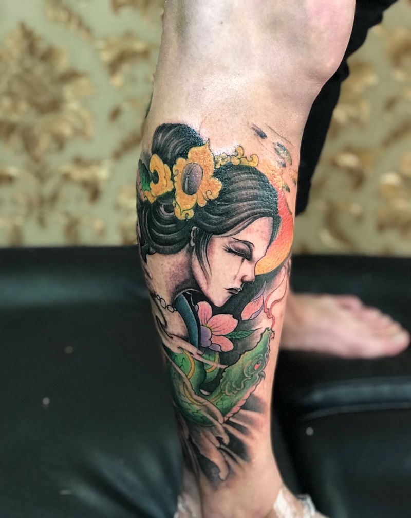 色诱纹身图片_腿部新传统艺妓纹身图案