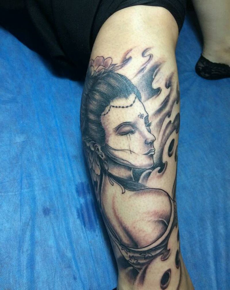 当前位置: 首页 >陕西省宝鸡市纹身店-文博刺青工作室纹身图案>小腿古风美女纹身图片