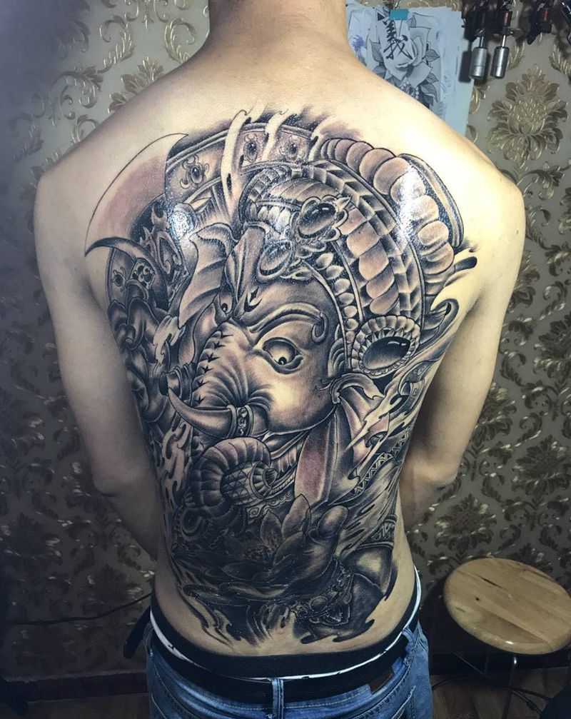 当前位置: 首页 >陕西省宝鸡市纹身店-文博刺青工作室纹身图案>象神纹身图片_背部传统宗教成品纹身图案
