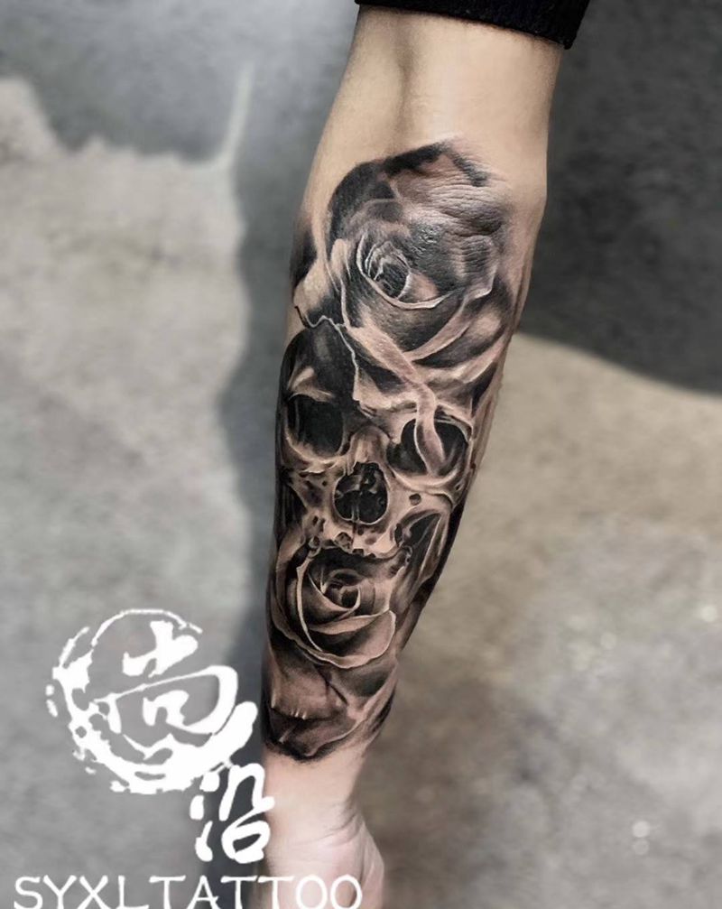 骷髅玫瑰纹身图片_手臂欧美写实纹身图案