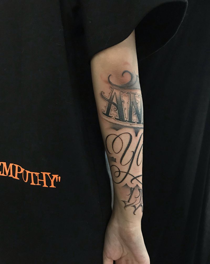 当前位置: 首页 >甘肃省兰州市纹身店-兰州惟刺青纹身图案>情侣花体字纹身图片_手臂花体字纹身图案
