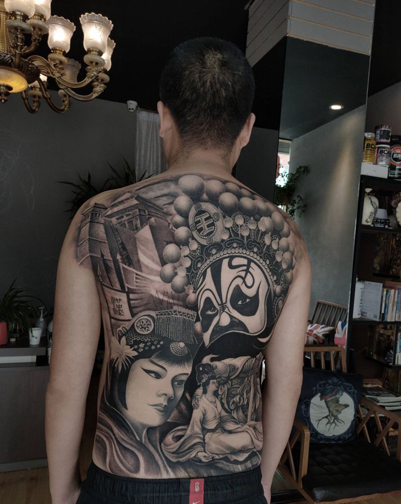 霸王别姬纹身图片_背部新传统欧美写实纹身图案