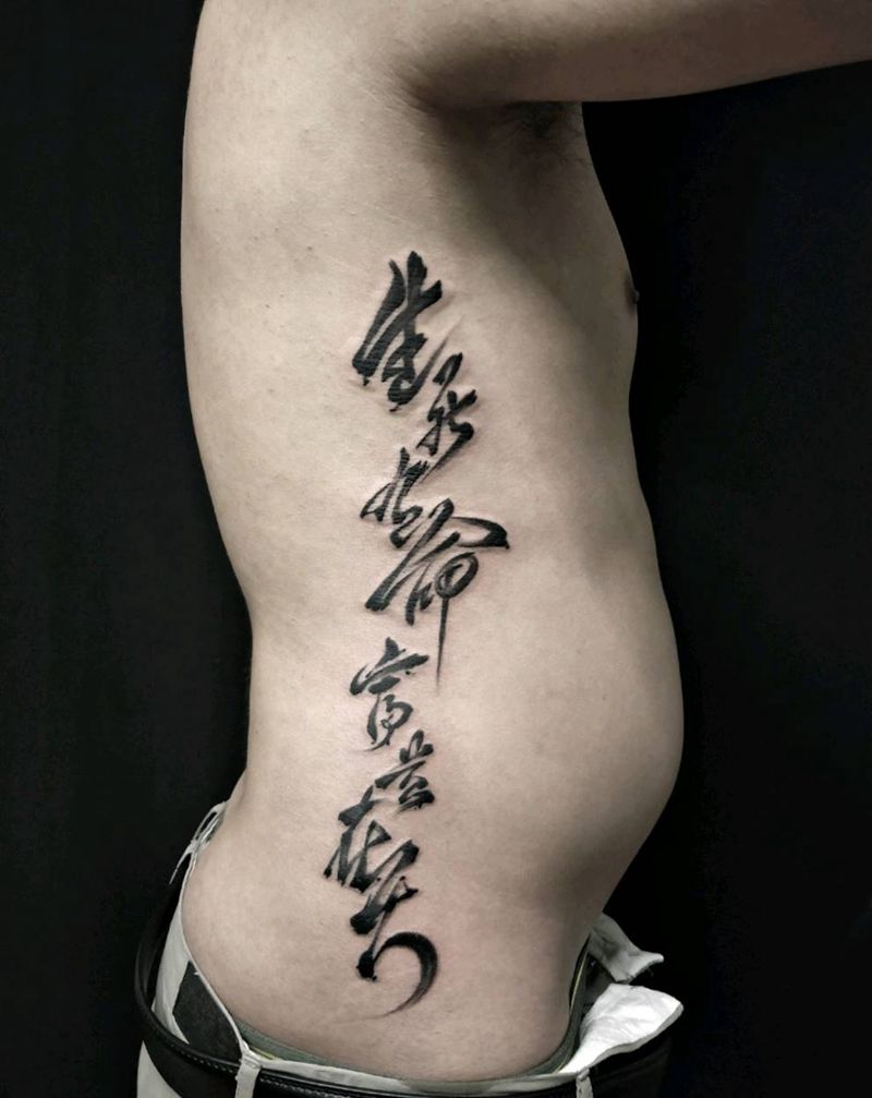 书法毛笔字纹身图片_腰部腹部水墨书法字纹身图案