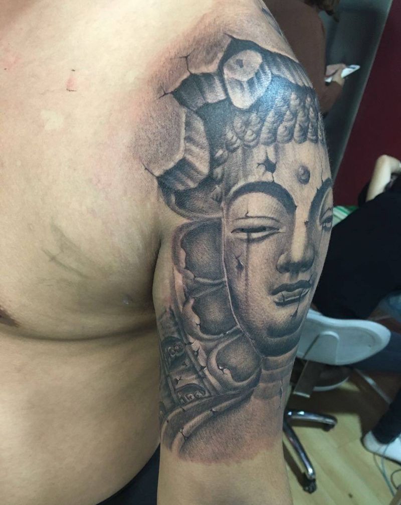 当前位置: 首页 >宁夏银川市纹身店-银川市金凤区佛陀刺青店纹身图案>石裂佛纹身图片_成品手臂传统肖像写实人物鬼神宗教纹身图案