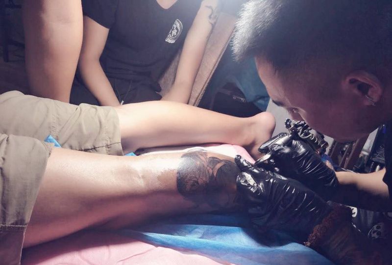 • T包小腿吹火男+阿多福纹身图片_腿部老传统新传统吹火男阿