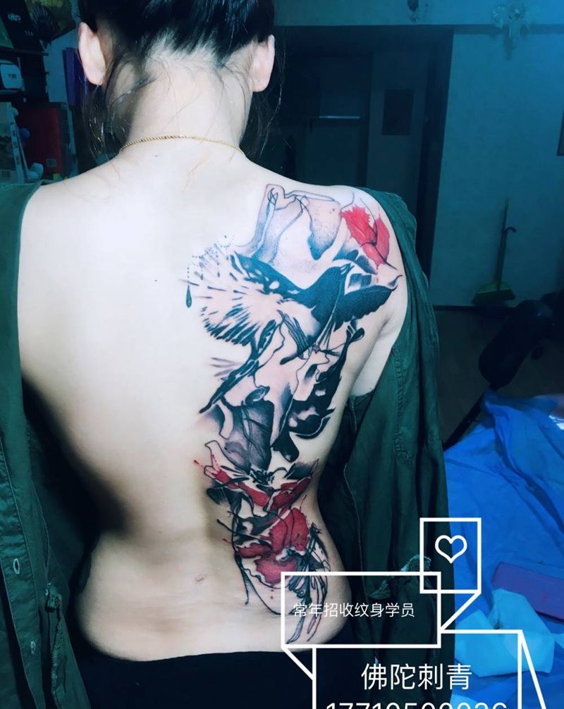 当前位置: 首页 >宁夏银川市纹身店-银川市金凤区佛陀刺青店纹身图案>水墨半背纹身图片_成品手稿背部国画植物动物宁夏银川文身 学习纹身图案