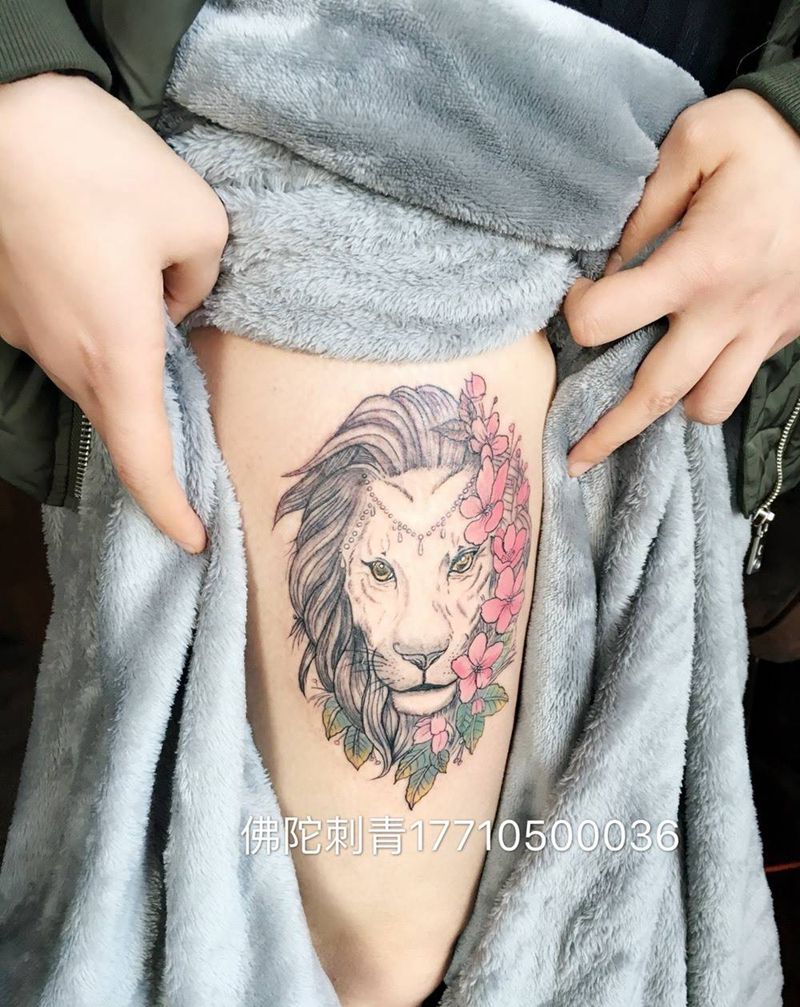 狮子座纹身图片_成品腿部动物宁夏银川文身 学学习写实纹身图案