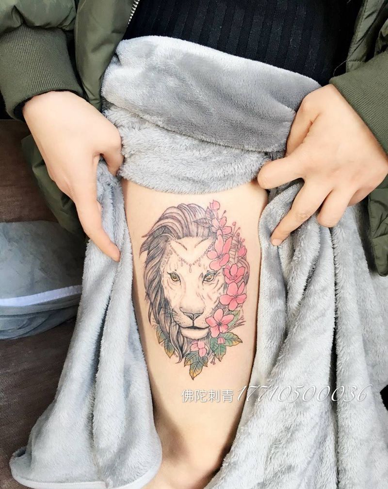 狮子座纹身图片_成品腿部动物宁夏银川文身 学学习写实纹身图案