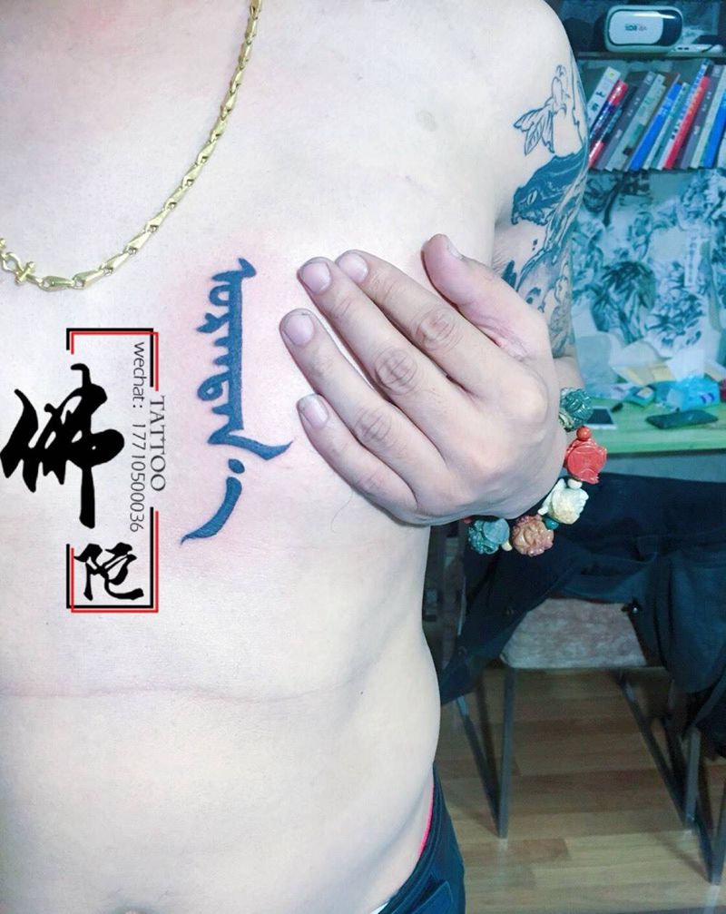 当前位置: 首页 >宁夏银川市纹身店-银川市金凤区佛陀刺青店纹身图案>蒙文纹身图片_胸部Old School字体纹身图案