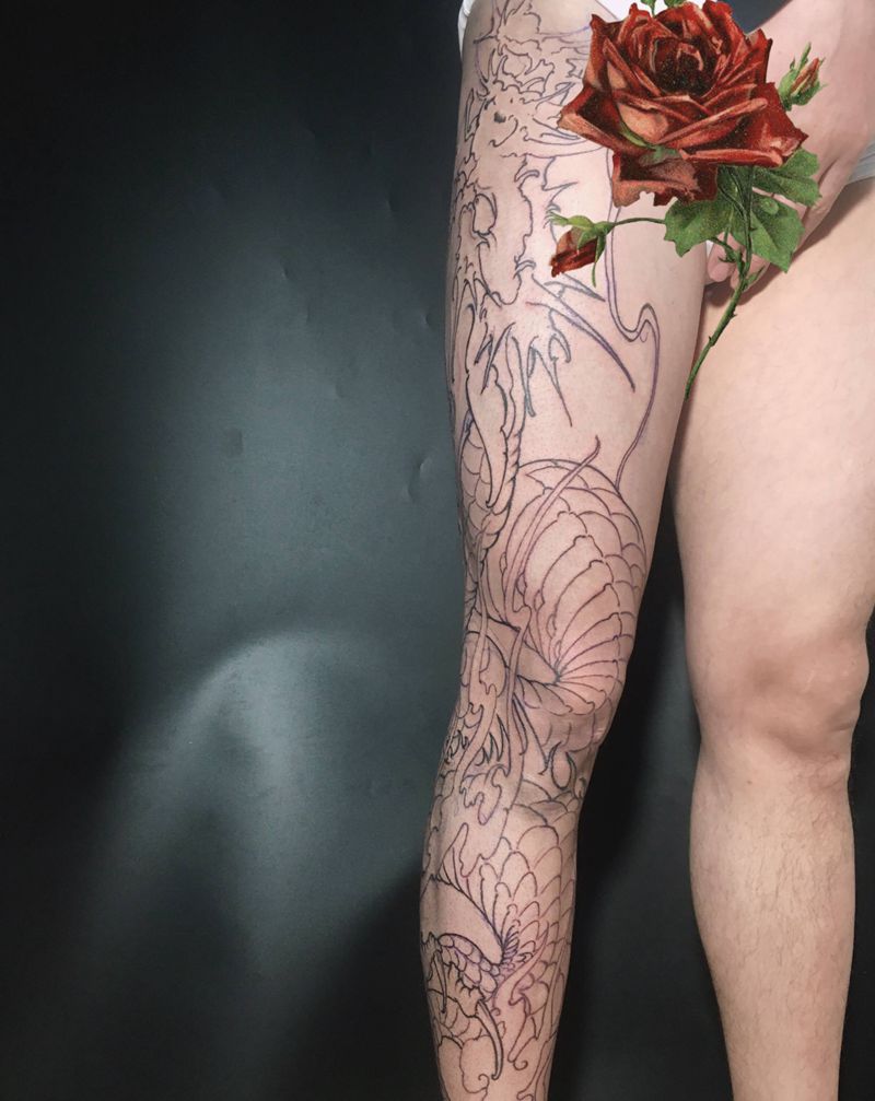 • T网红王老大花腿龙纹身图片_腿部新传统纹身图案