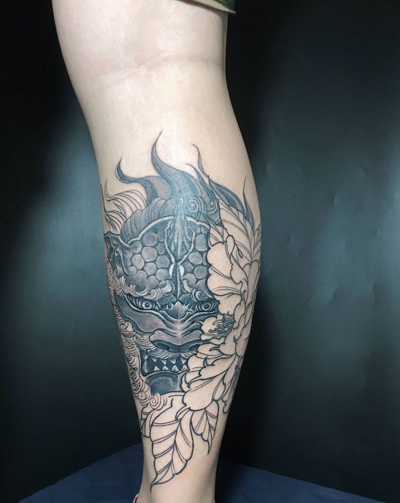 当前位置: 首页 >宁夏银川市纹身店-银川市金凤区佛陀刺青店纹身图案>唐狮未完纹身图片_腿部新传统纹身图案