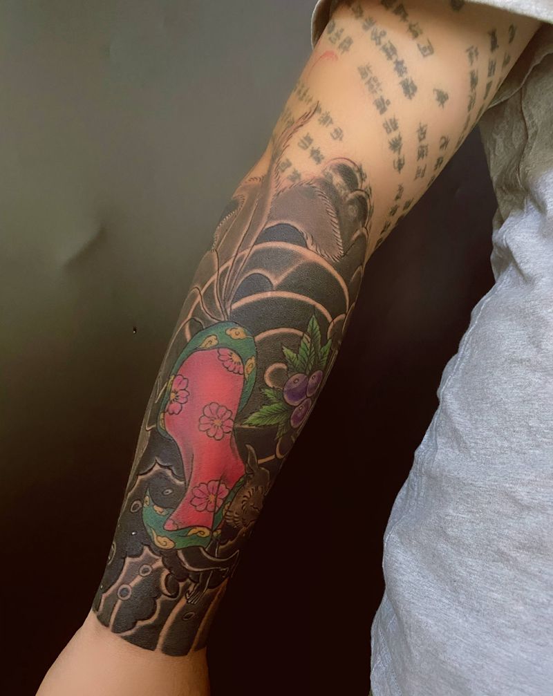 当前位置: 首页 >宁夏银川市纹身店-银川市金凤区佛陀刺青店纹身图案>遮盖 添加融合纹身图片_手臂老传统纹身图案