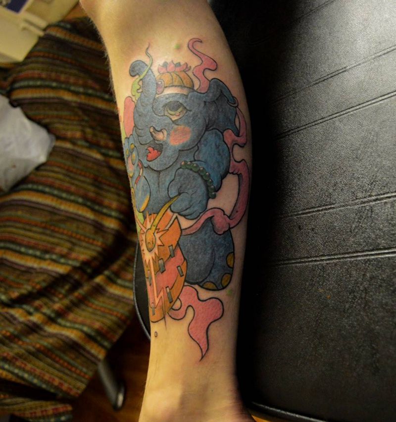 • T包小腿吹火男+阿多福纹身图片_腿部老传统新传统吹火男阿