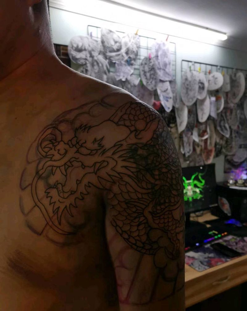 当前位置: 首页 >新疆乌鲁木齐市纹身店-鲲刺青纹身工作室纹身图案>半胛龙
