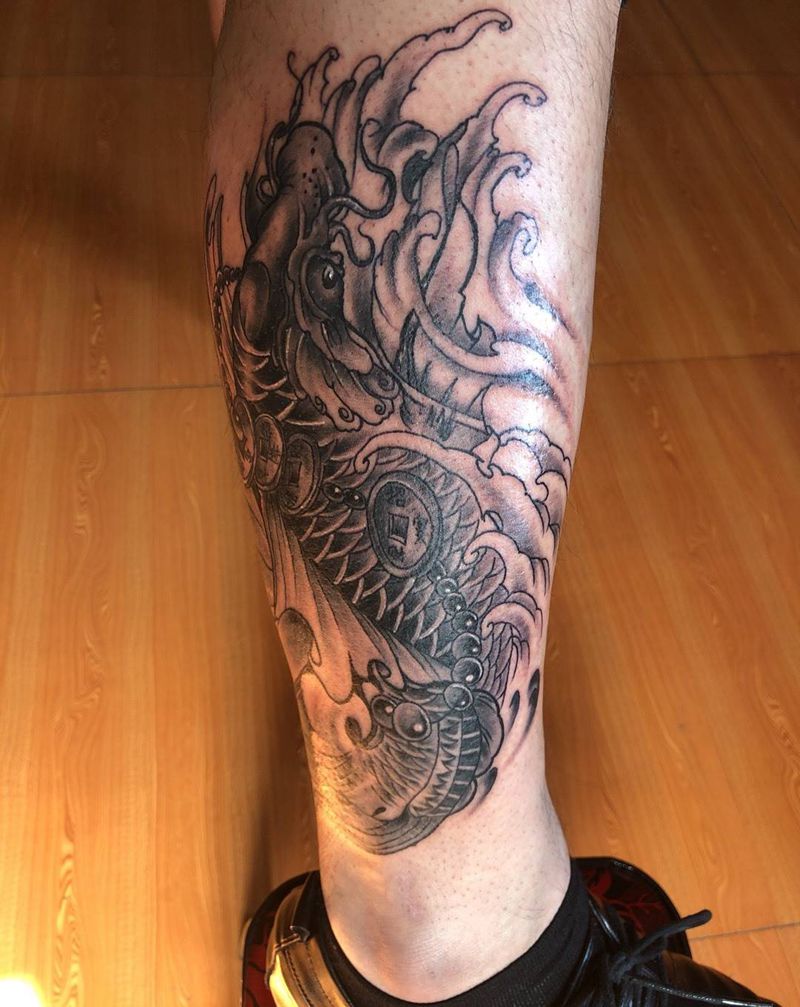 • T网红王老大花腿龙纹身图片_腿部新传统纹身图案