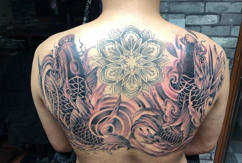 当前位置: 首页 >新疆乌鲁木齐市纹身店-肆義刺青纹身图案>锦鲤加梵花纹身图片