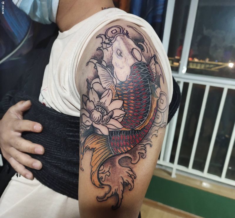 大臂鲤鱼未完成纹身图片_手臂老传统纹身图案