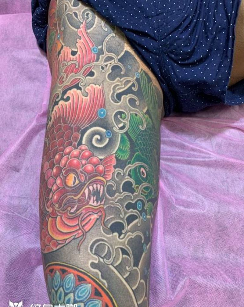• T网红王老大花腿龙纹身图片_腿部新传统纹身图案
