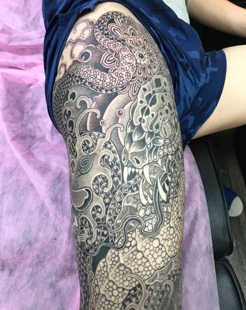 • T网红王老大花腿龙纹身图片_腿部新传统纹身图案