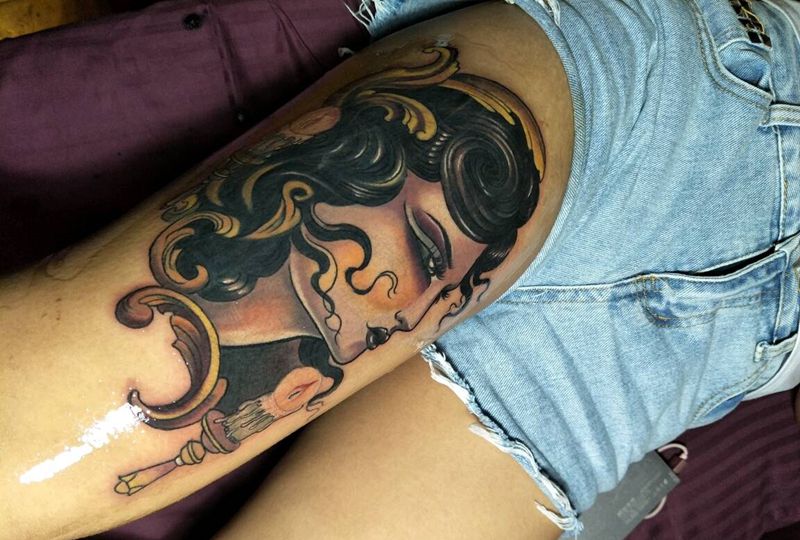 • T包小腿吹火男+阿多福纹身图片_腿部老传统新传统吹火男阿