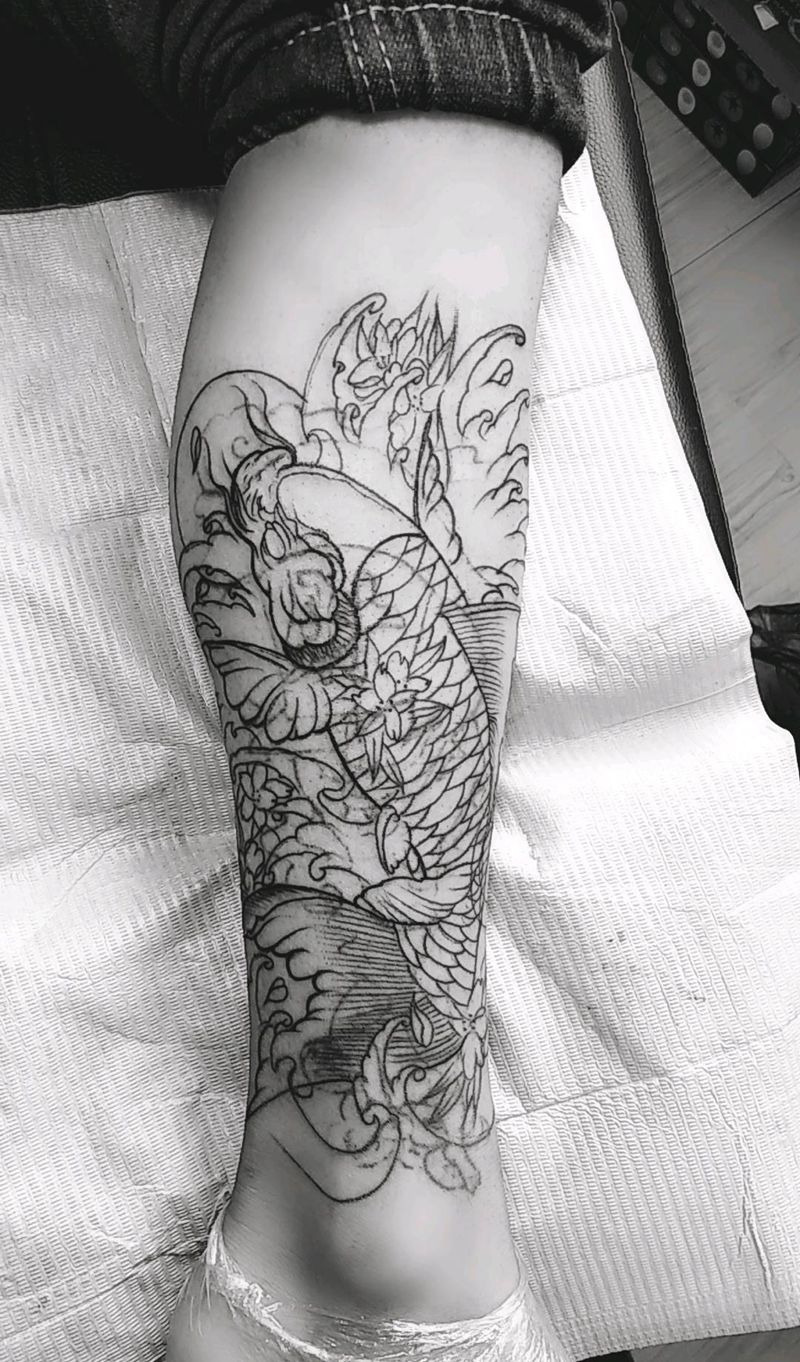 大臂 荷花 未完成纹身图片_手臂新传统纹身图案